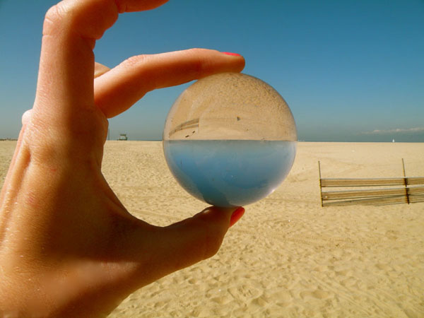 This photo was contrived by placing a transparent sphere against the beach horizon. By matching the refraction from the sphere with the point where the shoreline and skyline meet, this photo demonstrates the physics of refraction. By means of refraction, lenses form an image. The glass sphere in this photo acted as a lens causing the inverted image. This photo was taken at the Venice beach in Los Angeles, California and shows the beauty of combining physics with ones own natural surroundings.