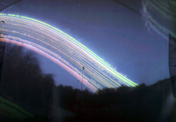 This image was taken over a 45-day exposure using a paint-can pinhole camera. As the sun moves across the sky, it burns an image into the photopaper placed inside the paint can. Each streak corresponds to a day and the gaps or incomplete streaks are caused by overcast weather that day. This technique is called solargraphy. Over longer exposures it is possible to see how the height of the streak changes in relation to the seasons. The streaks are not perfect arcs because of the warped nature of the photopaper while wrapped up in the paint can. All that is required besides a pin hole camera is black and white photosensitive paper. Oddly, not only is the final exposure in color, but it doesn?t even have to be developed. The negative was scanned, horizontally flipped, the colors inverted, and here it is! The presence of color is due to the degradation of the chemicals in the photopaper.