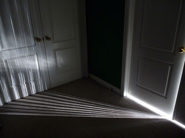 This picture, taken in the hallway of a house, shows the interference of light diffracted through a narrow opening between two doors. Sunlight streams in from a large bathroom window behind the double doors on the right. One door is slightly pushed back so that there is a 1cm space between it and the other door. When the light travels through this opening, it diffracts and spreads out. At the same time, interference between the emerging waves occurs, causing alternate bands of light and dark. This pattern of dark and light fringes can be seen on the carpet and opposite bedroom doors as shown in the photograph. The interference pattern is so clear that subdivisions of additional bands of light and dark within each bright fringe are also visible. This happens because the source of light is very bright and the projecting screen is far enough from the door slit.